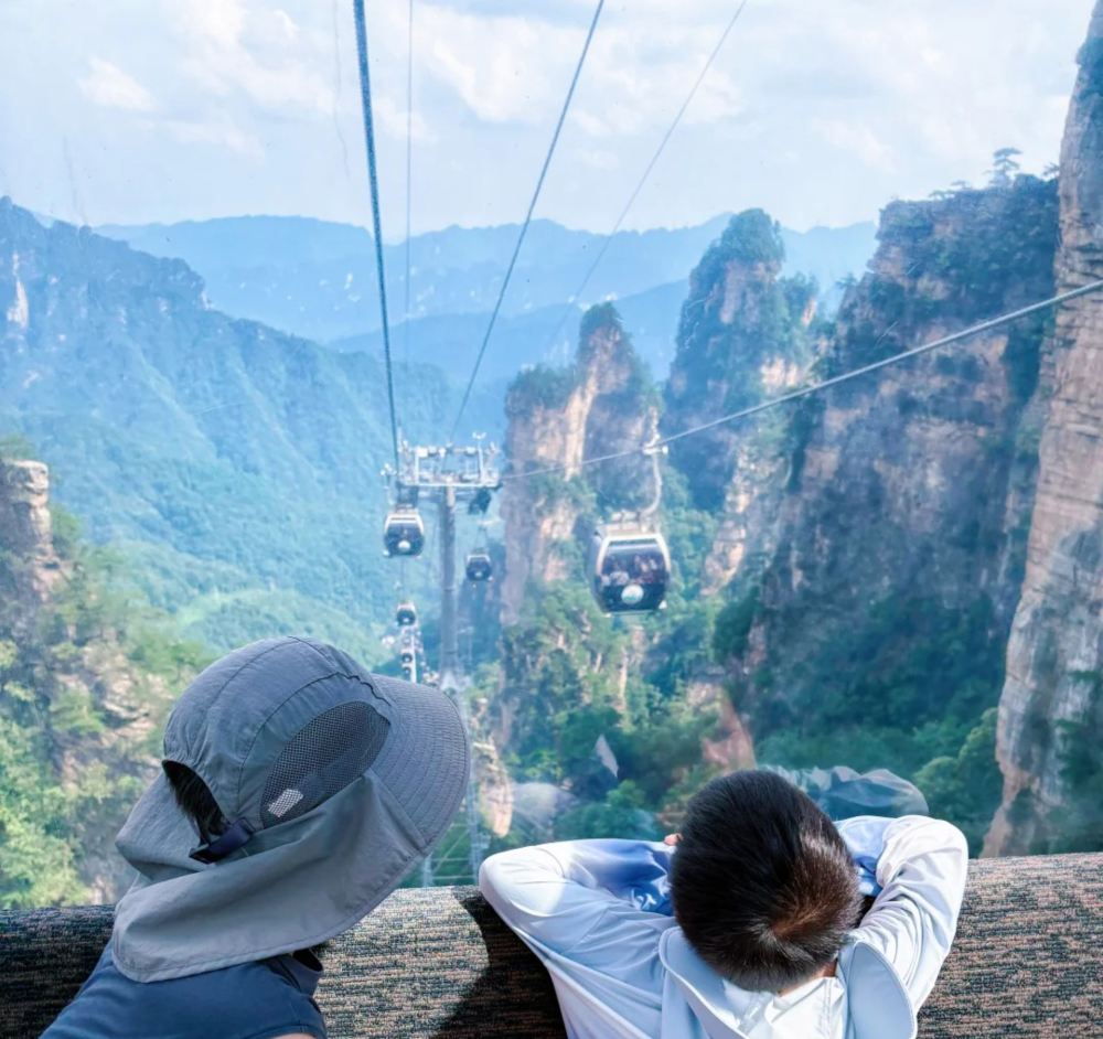d. 天子山索道:搭乘索道緩緩下降,沉浸在「峰林之海」中。當山間雲霧繚繞時,彷彿置身仙境。