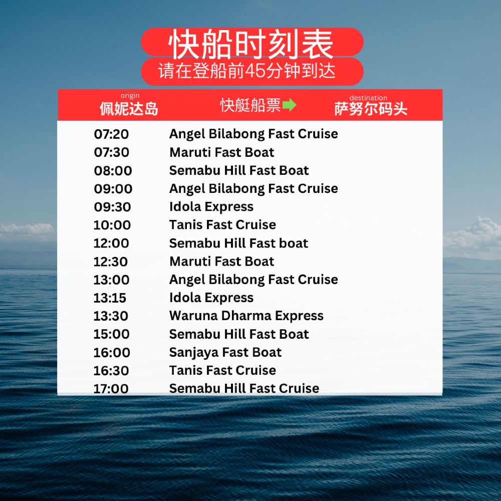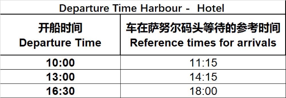 如果選擇了船票及用車產品,以下是佩妮達島-峇里島薩努爾碼頭,車在薩努爾碼頭等到的參考時刻表(時間僅供參考,如有變動,實際以當地交通情況為準),工作人員會在最晚提前一天晚上23:30之前聯繫您告知用車資訊,請您耐心等待