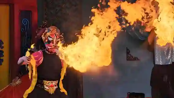 渝潮坊内奇技彰,变脸如幻惊四座,喷火烈烈燃激情,共赏巴蜀绝艺章。