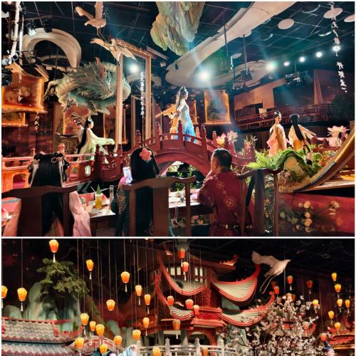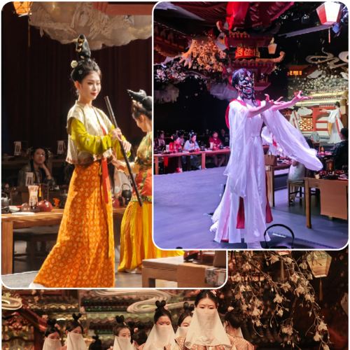 - 以歌舞詩詞引出每道菜,更奇妙的是光影打在盤子上用動畫解說菜品的來歷淵源,味道也超出想像的好吃,可以稱得上古典米其林,讓人沉浸式探索了古代文化之美的盛宴,八道菜配舞曲和互動,若有時間你可以提前預約尚衣局扮個妝容,古代帝王盛宴也不過如此~
