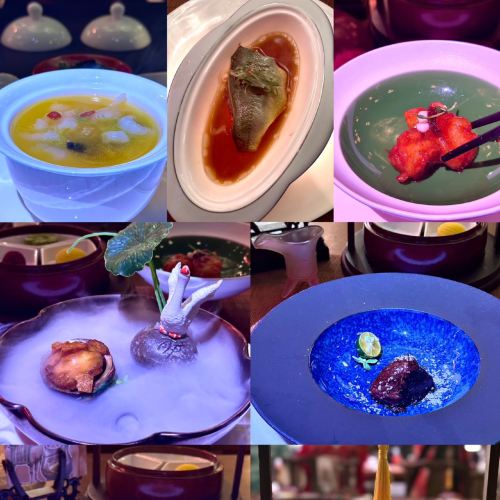 - 中式omakase的菜餚,每道用膳前都有短片/宮廷式歌舞相配,從海裡的海參、魚蝦,吃到陸地、深山的珍貴食材,不減中式宴請至美的傳統風格