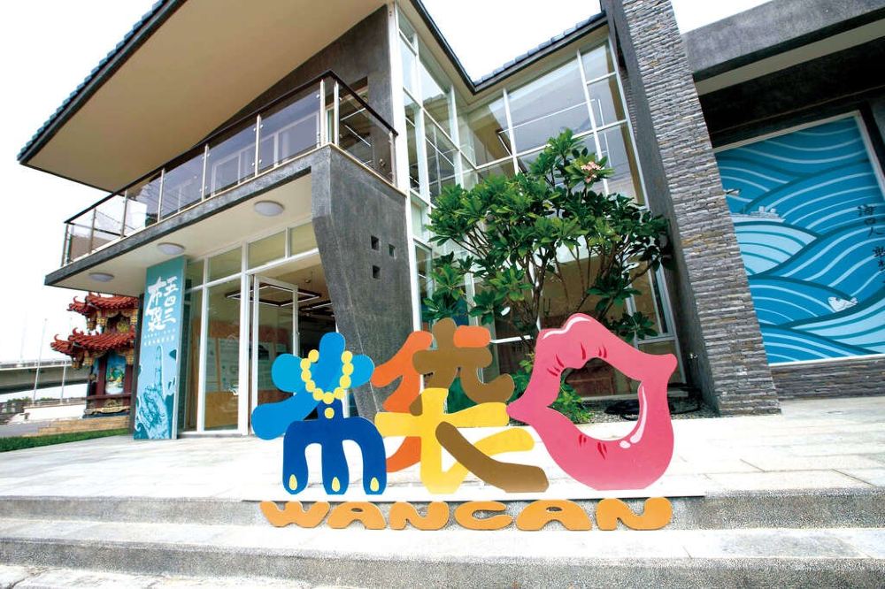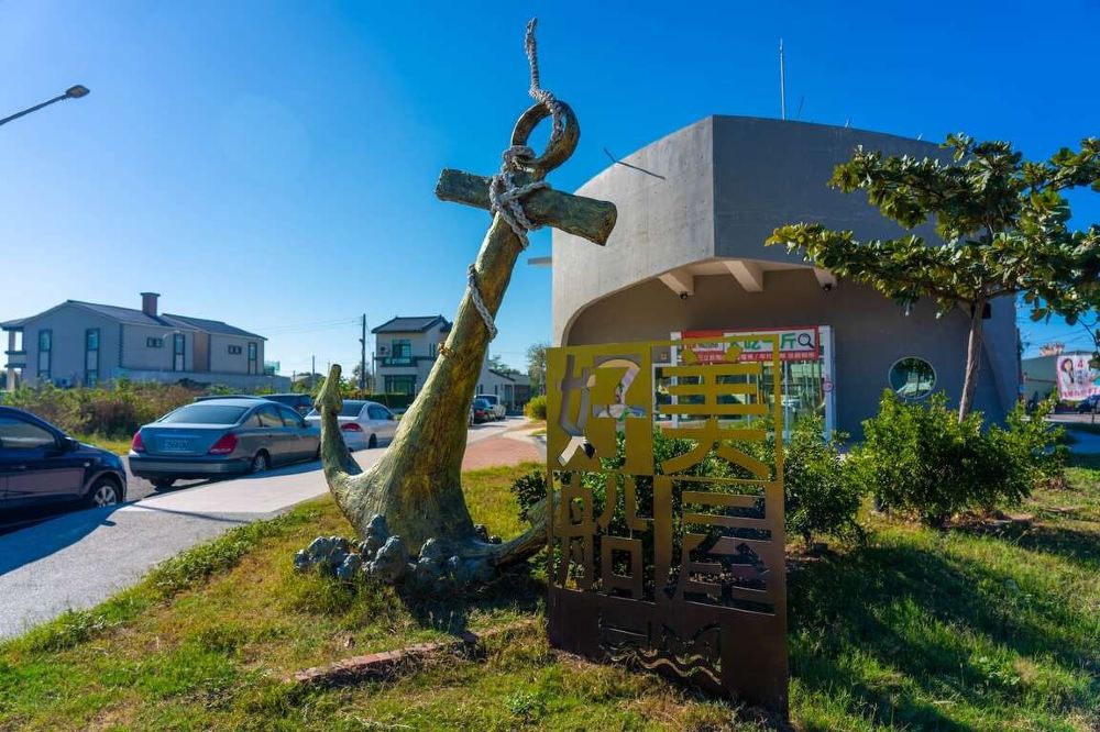 ▲ 布袋五四三故事館門口設有「布袋嘴」裝置藝術,布袋嘴正是布袋的舊地名。這座故事館前身為「財政部高雄關稅局布袋留置所」,當地人慣稱「海關」,如今透過藝術策展呈現布袋的歷史變遷與人文風貌,以創新有趣的方式讓遊客深入認識布袋。故事館一樓以畫作展現布袋400年歷史演變,每幅畫代表一個殖民時期:台灣史前時期、荷鄭時期、清領時期、日治時期及台灣光復後時期。其中光復初期因布袋與中國海運興盛,更贏得「布袋小上海」的美譽。