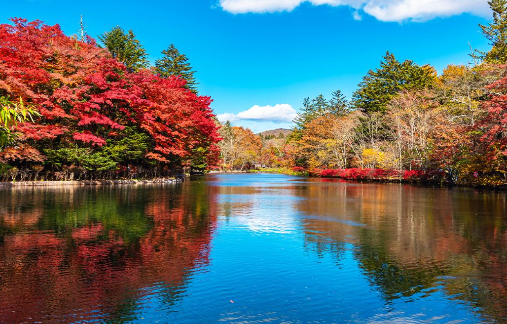 ▲ 雲場池是位於長野東南部地區的湖泊,這個被稱為天鵝湖的池,適合森林浴,是夏季的避暑勝地。被兩岸紅通通的楓樹雲場地的林吸引,雲場池的紅楓是紅河,倒映在湖中,可謂如詩如畫。